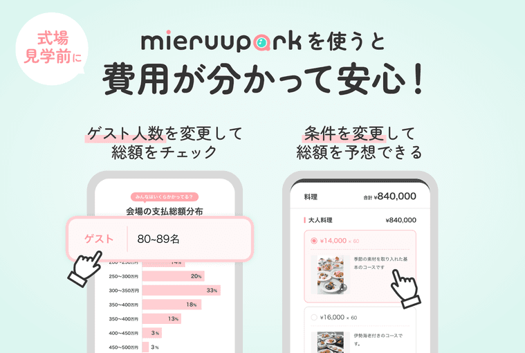 先輩カップルのリアルな結婚式費用の事前シミュレーションができる「mieruupark(ミエルーパーク)」の利用を推奨しております